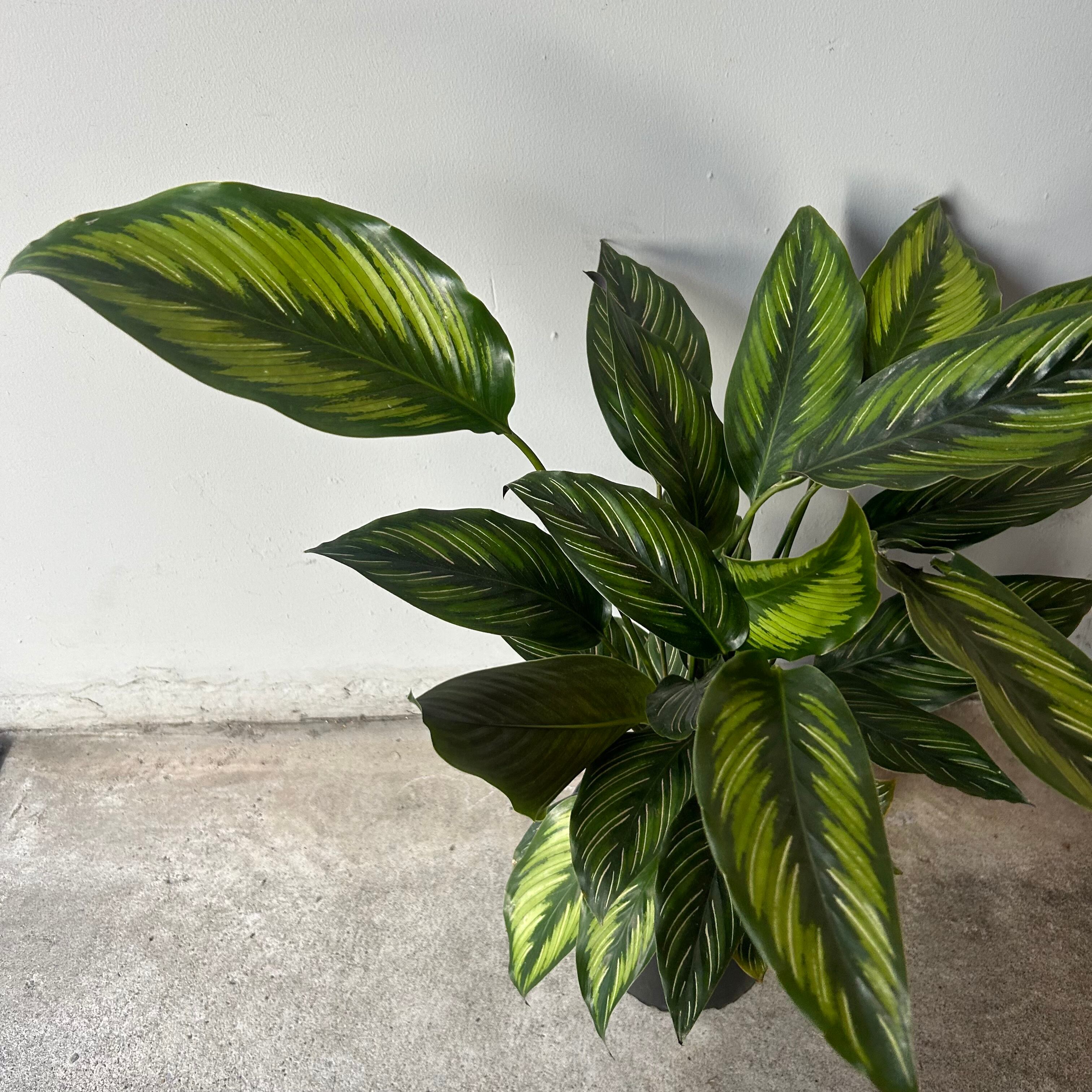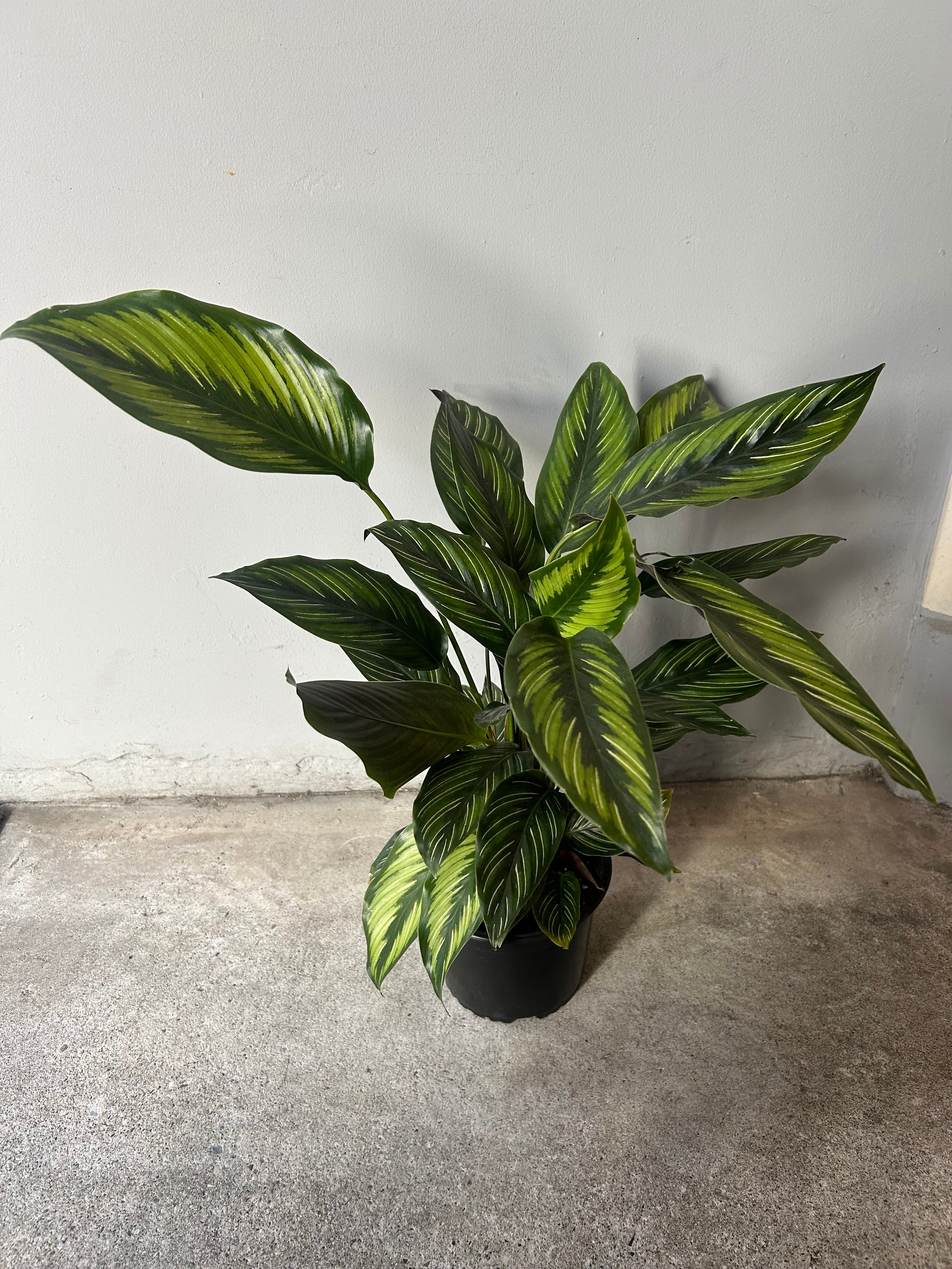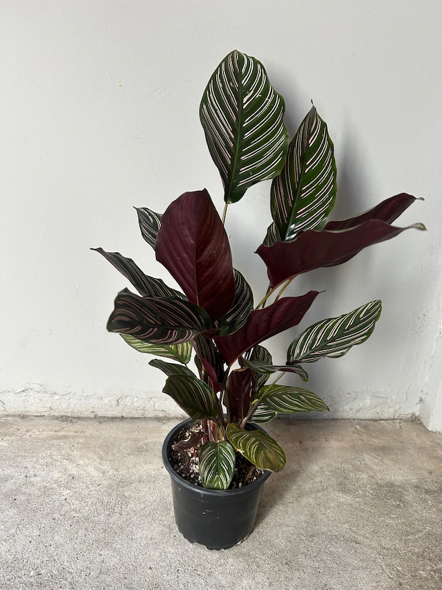 カラテア 表記がないのですが、たぶん品種名 ビューティースター グリーン基調の水彩画のような、繊細で美しい模様です。 ハルカゼ定番おすすめ植物です! 水やり 週1程度 土の表面が乾いたらたっぷり 直射日光の当たらない明るい場所がおすすめ 葉に霧吹きをしてあげるのも喜びます。 高さ約60cm 幅約35cm
