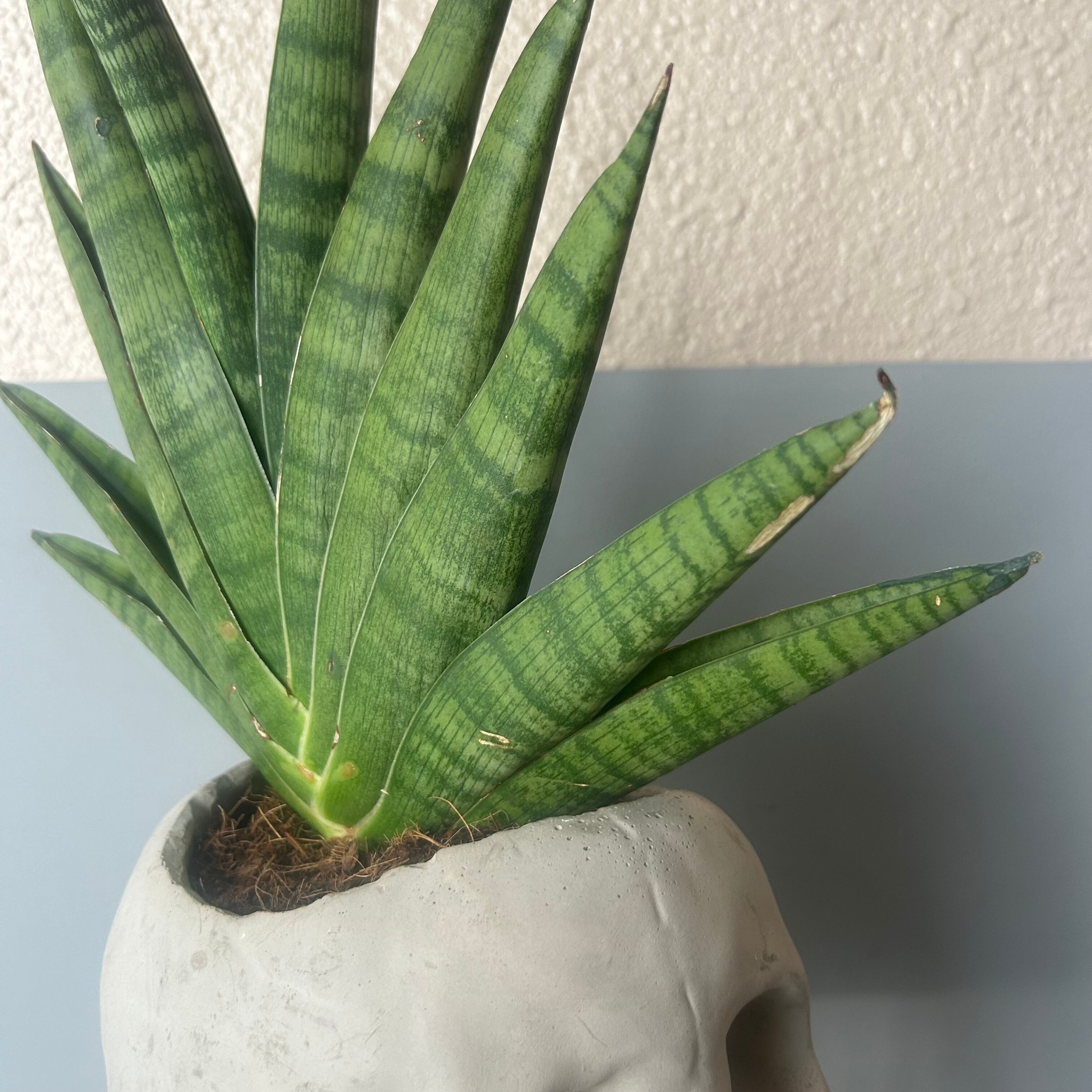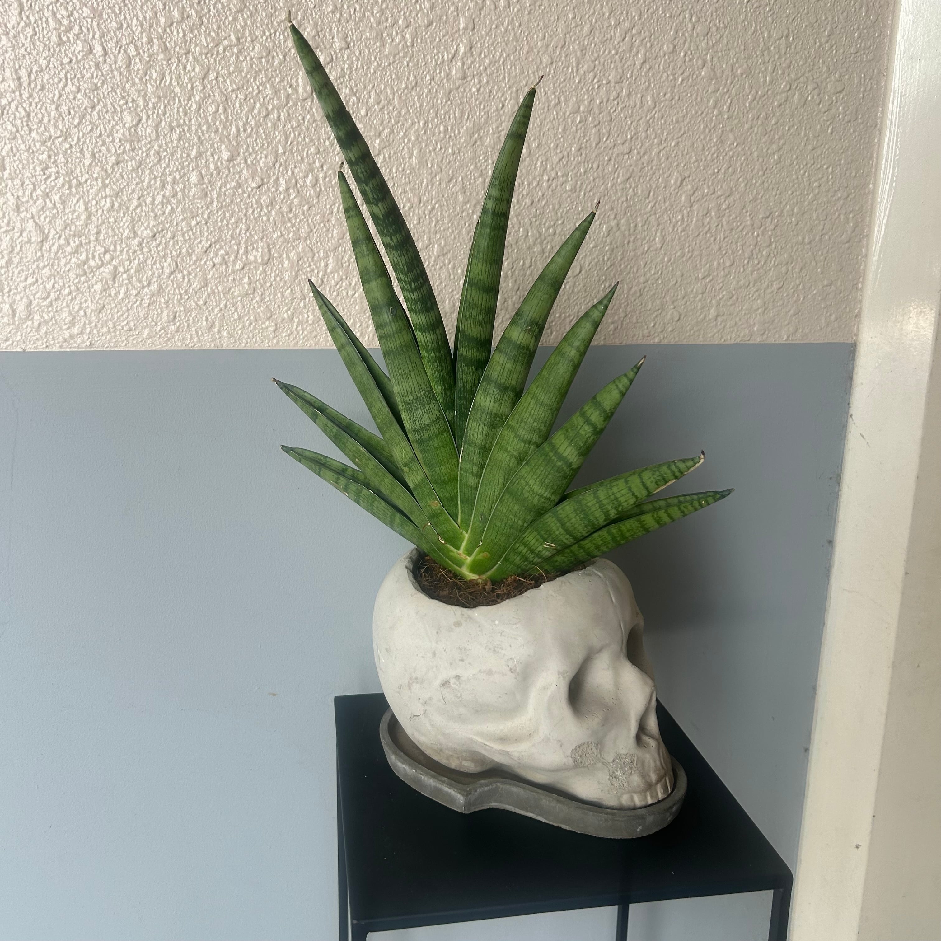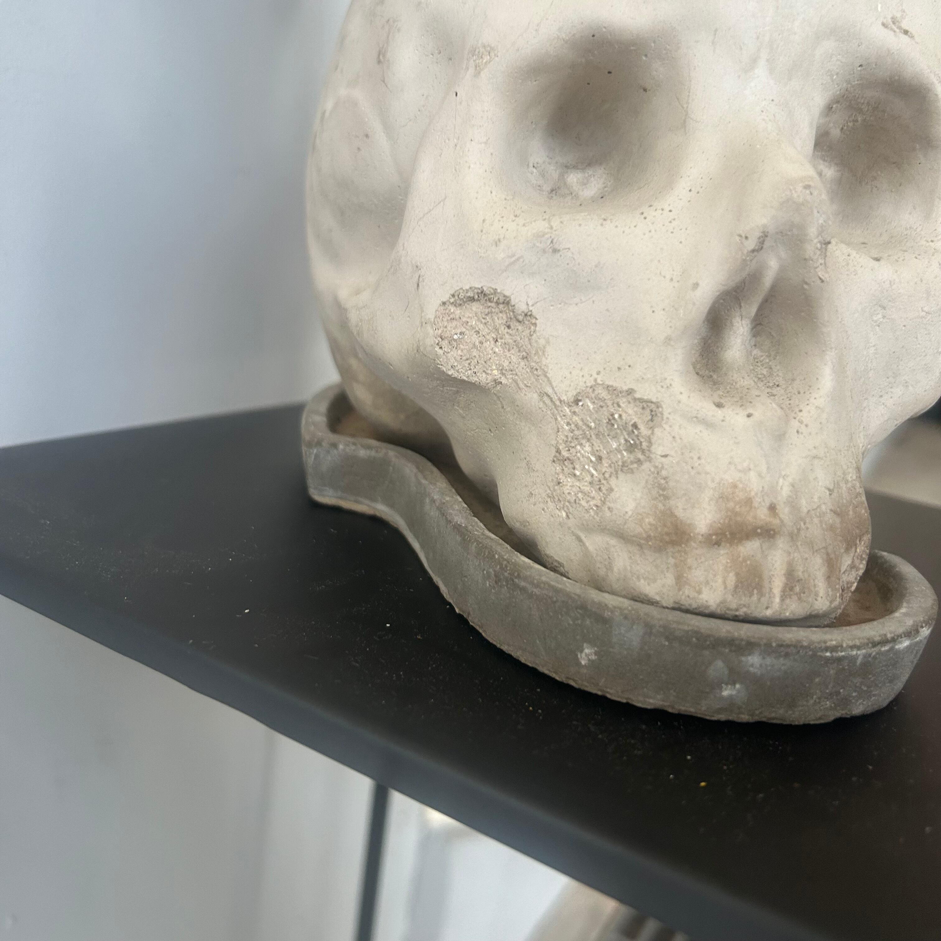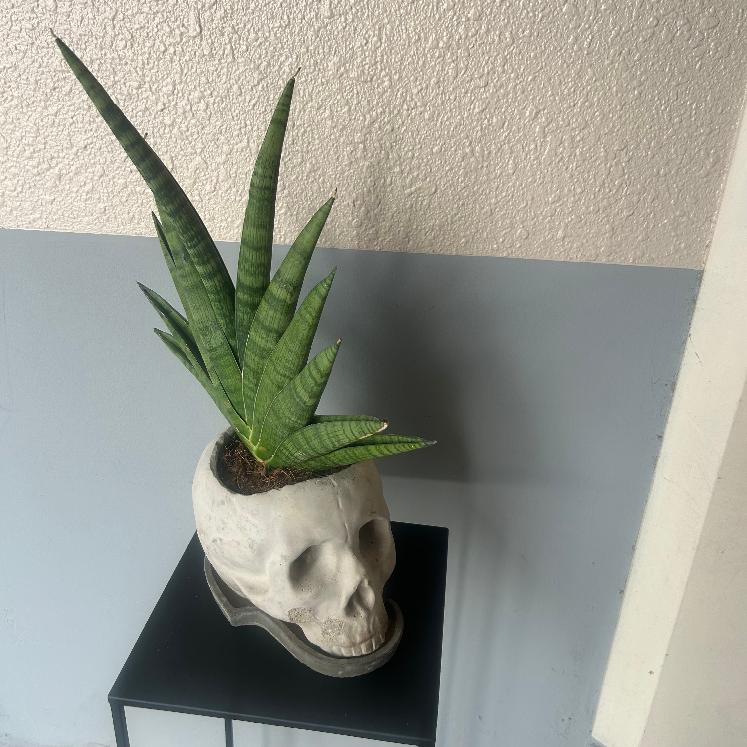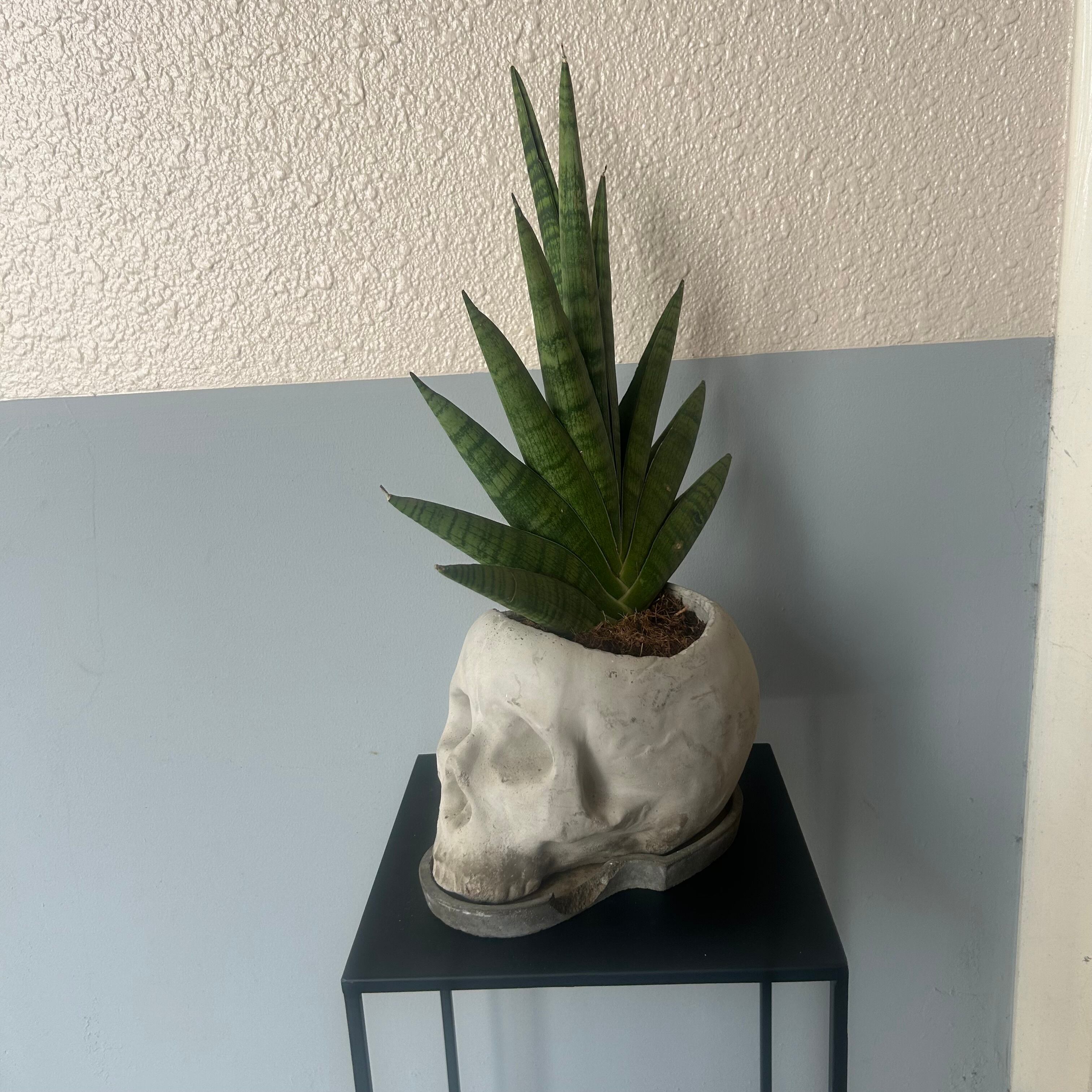 Exploitedのレコードジャケットみたい トロージャンヘアのスカル君です。 植えているのはサンセベリア'インディ' 暗めの場所でもよく育ち、お水やりも月1程度の控えめで大丈夫です。 サンセベリアは空気を綺麗にする力が強いようです。 鉢皿や、右頬などにカケがあるため、気にならない方、味だと思ってくださる方にぜひ 横向きの状態で、幅約30cm 高さ約45cm 奥行き約15cm
