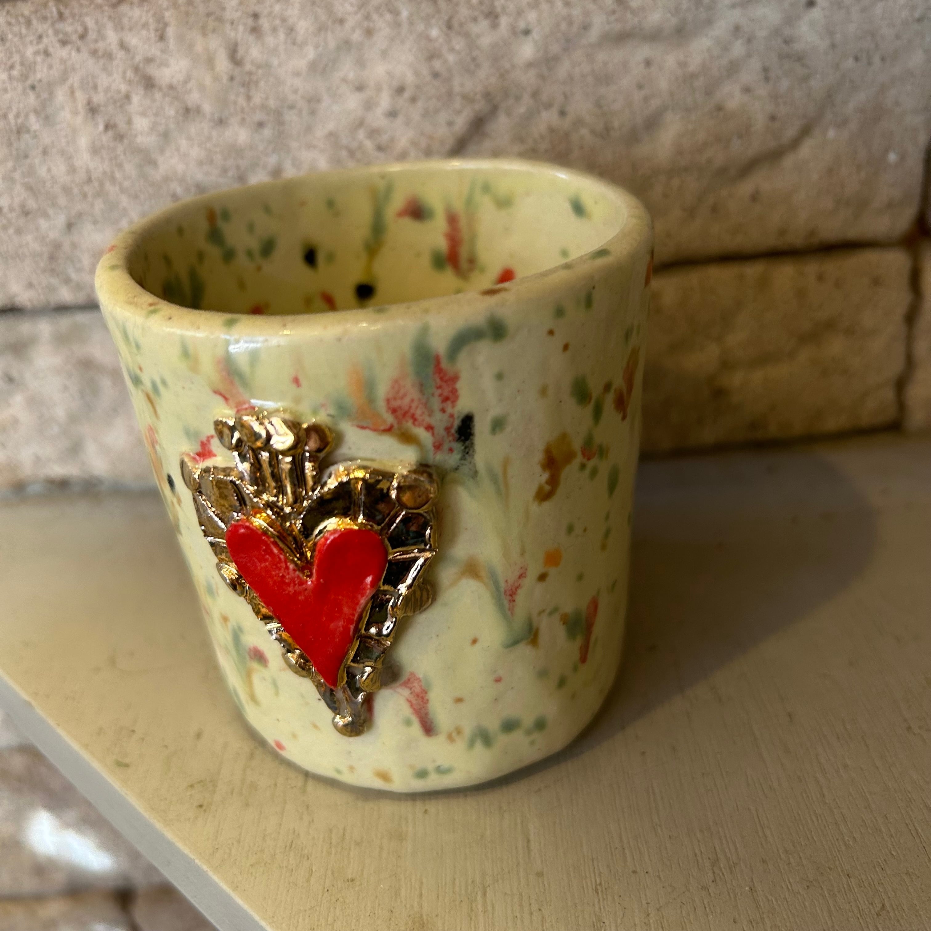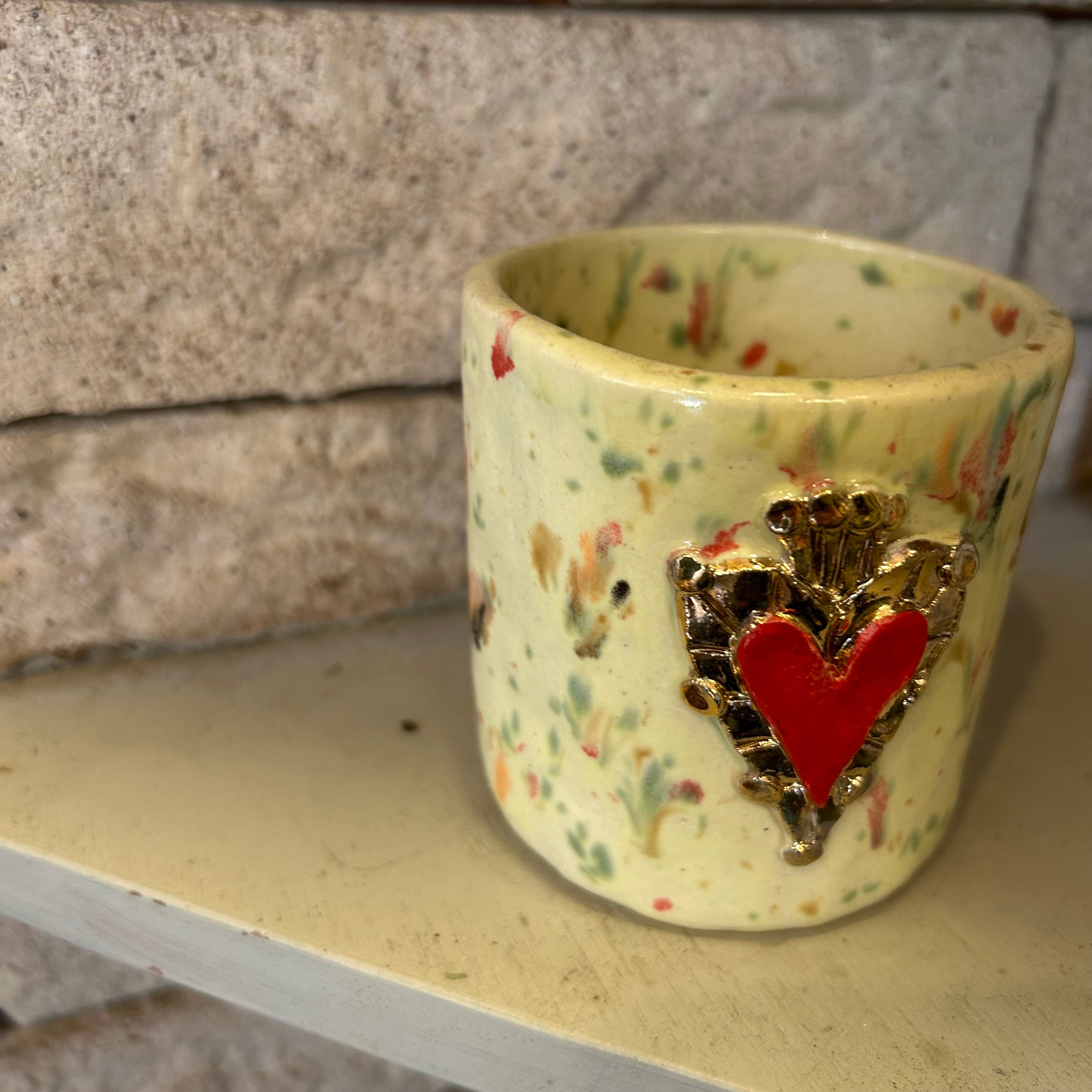 セラミックアーティスト Koyomi Yanagimoto さんの植木鉢です。 底穴あり。 コヨミさんの、ハートのモチーフも人気のデザインです。 落ち着いた色みも温かみがあって素敵ですね。 小さめの鉢なので、何か植えるならサボテンや多肉植物がおすすめです。 高さ約7cm 直径約7.5cm
