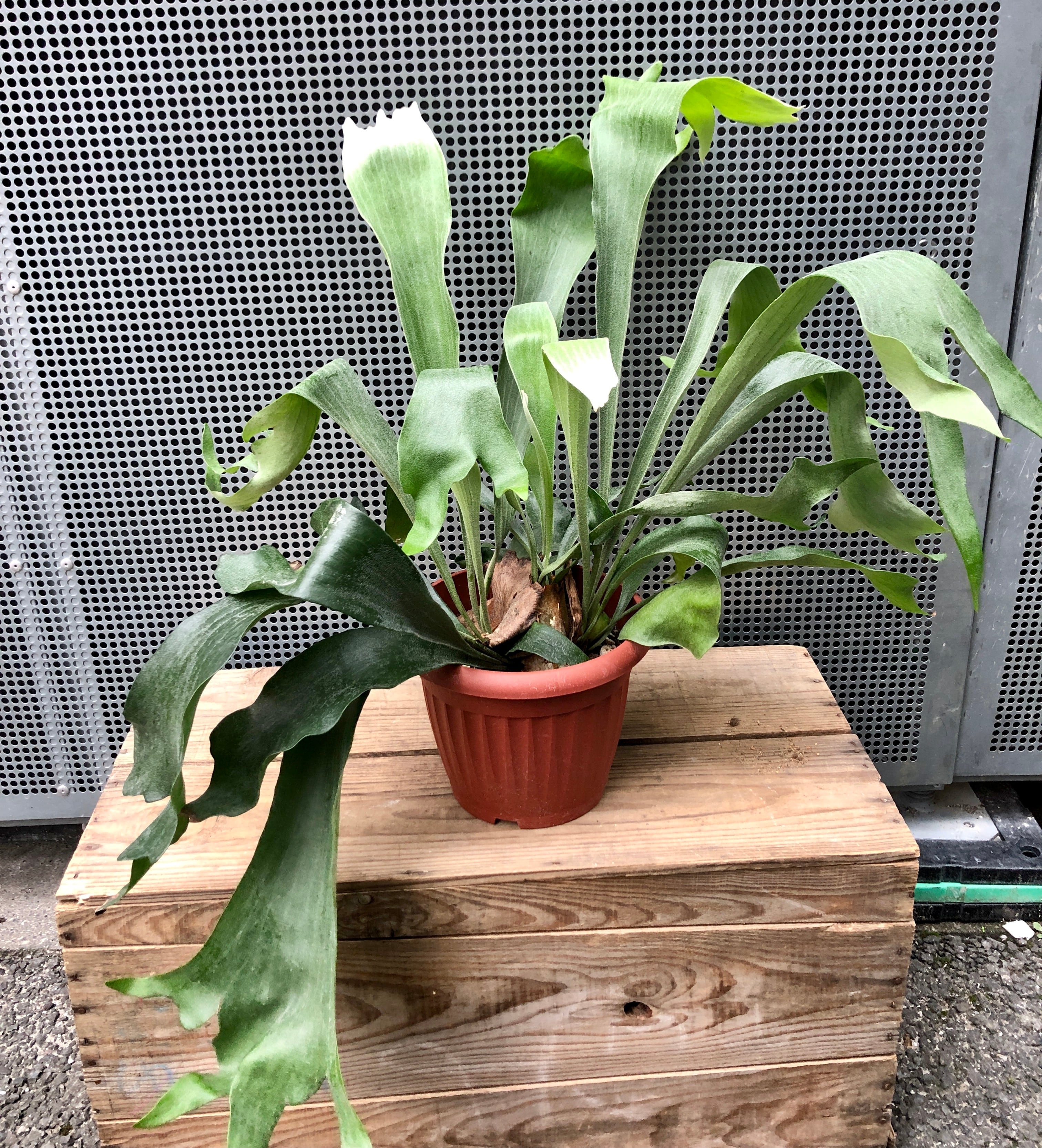 樹木などに着生する植物。コウモリっぽいのでコウモリラン。 直射日光避けて明るい所で育ててやって下さい。 お水は大好きですが、あげすぎ注意。 縦約55㎝、幅約60㎝