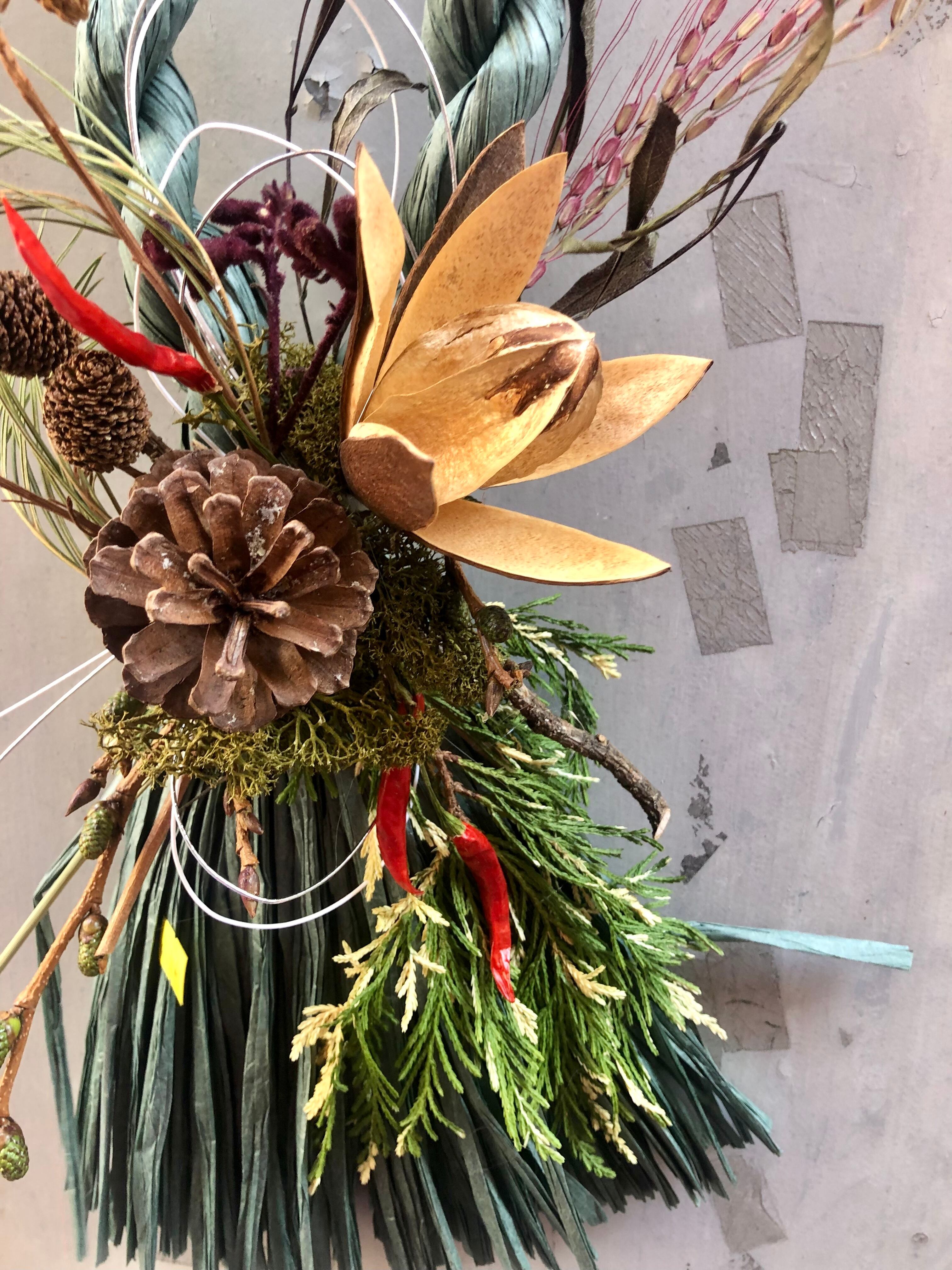 深いグリーンの、落ち着いた雰囲気のしめ縄 サイズ縦約37cm×横約17cm お気に入りのしめ縄で新年を迎えて、来年も元気に頑張っていきましょー‼︎ ※繊細な天然素材を使用しているため、配送時の多少の花落ちにご理解ください
